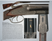 is a copy of the “The Double Gun Journal” from winter 1995 validating this information and showing beautiful photographs of this rare shotgun. Barrel and stock measurements (R/L): bore diameter nine inches from the breech .730/.734 inches; choke constriction .035/.047 inches; minimum wall thickness .025/.030 inches; 1 15/16 inch drop at comb; 3 1/16 inch drop at heel; 14 3/8 inch length of pull; weight 7 lbs 9 oz.