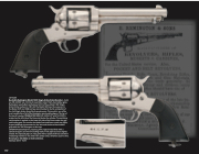 the Model 1875 and 1888 and was also intended to be the competitor of the Colt Single Action Army like its predecessors. This model is one of the most sought after of all of the Remington produced handguns. The top of the barrel is marked “REMINGTON ARMS CO. ILION, N.Y.,” and “44 C.F.W” is marked on the left side of the frame just below the cylinder. The matching serial number is marked on the lower left side of the frame under the grip and loading gate. The revolver has blade front and frame notch rear sights, lanyard stud and ring mounted on the butt and checkered hard rubber grips with the “RA” monogram at the tops.