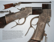 Scarce Factory Panel Scene Engraved Marlin Ballard No. 6 1/2 Rigby Off-Hand Rifle - Serial no. 14709, 38-55 cal., 30 inch round bbl., blue/casehardened finish, walnut stock. Manufactured from 1880 to 1882. The receiver is decorated with factory engraved scrollwork on a stippled background, heart borders and game scenes in circular panels. The game scene on the left side is an elk, and the game scene on the right side is a buck. Scrolls and heart borders decorated the flats of the chamber. Additional scrollwork appears on the barrel flats at the breech. The left side of the receiver has the two-line Marlin address/Ballard patent marking. The rifle is fitted with a windgauge front sight and a mid-range Vernier tang sight. The highly figured select walnut forearm and pistol grip stock are checkered. The buttstock has a cheek piece and nickel plated Swiss buttplate. CONDITION: Very fine. The barrel retains 80% original blue finish with some scattered light