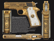 Parabellum cal., 4 inch round bbl., gold damascene finish, pearlite grips.